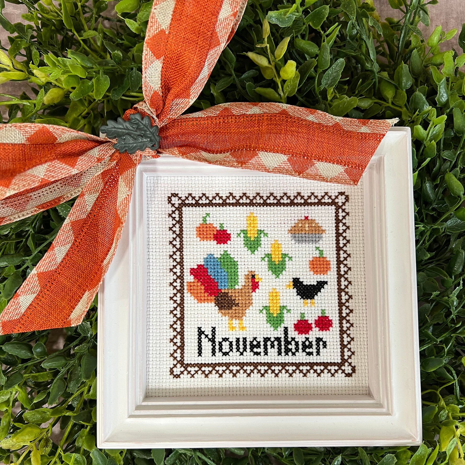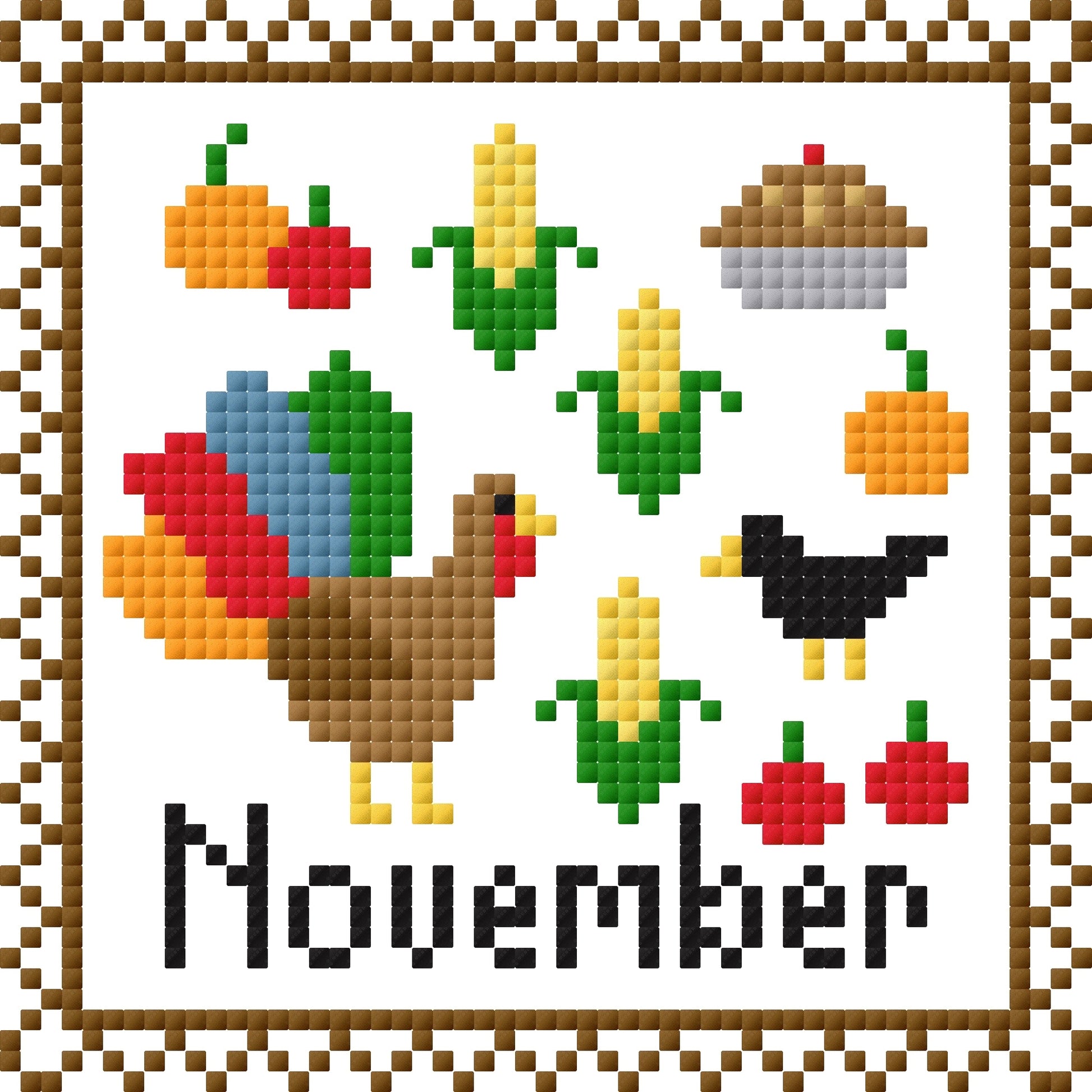Come stitch this cute monthly postage stamp with me! This is the November postage stamp. It features a Turkey, corn, a crow, pie and squash and apples. Perfect for a Thanksgiving feast! It will be the perfect addition to your Thanksgiving decor!