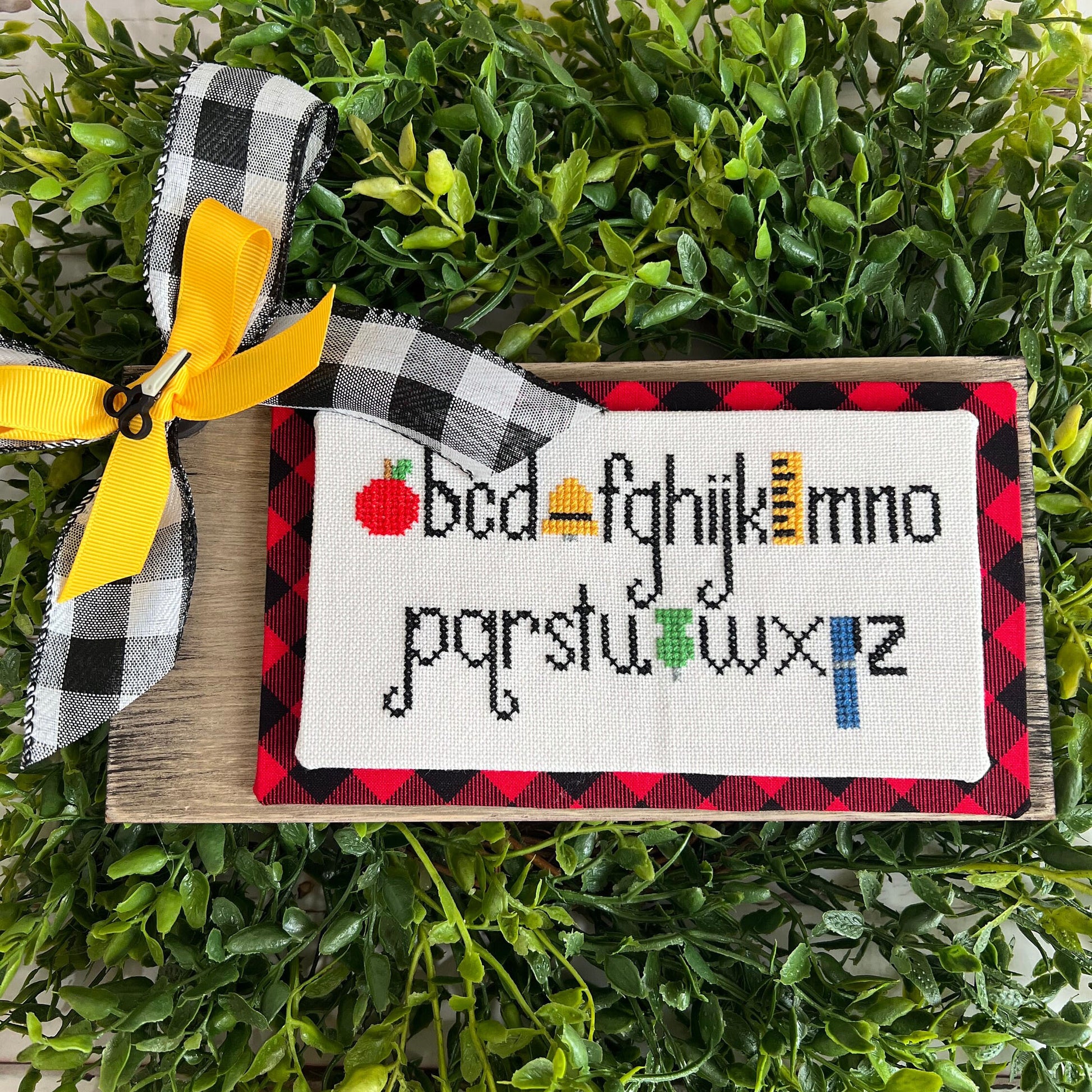 Themed alphabet cross stitch pattern for the month of September. I love quick little stitches and this one is my spin on a mini alphabet! Great for beginners! You can use it to decorate back to school, classroom decor and so much more! It features a ruler, push pin, pen, school bell and of course an apple for teacher!